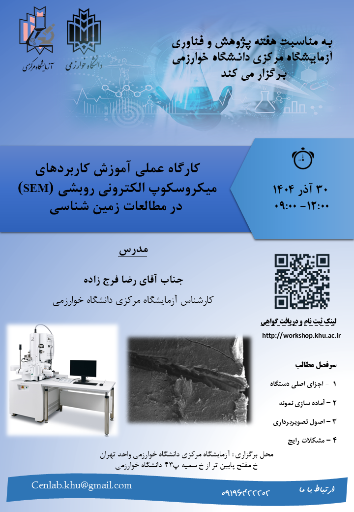 | کارگاه عملی آموزش کاربردهای میکروسکوپ الکترونی روبشی SEM در مطالعات زمین شناسی | جناب آقای رضا فرج زاده | ۱۴۰۴/۰۹/۳۰ ساعت ۰۹:۰۰ | https://workshop.khu.ac.ir | |