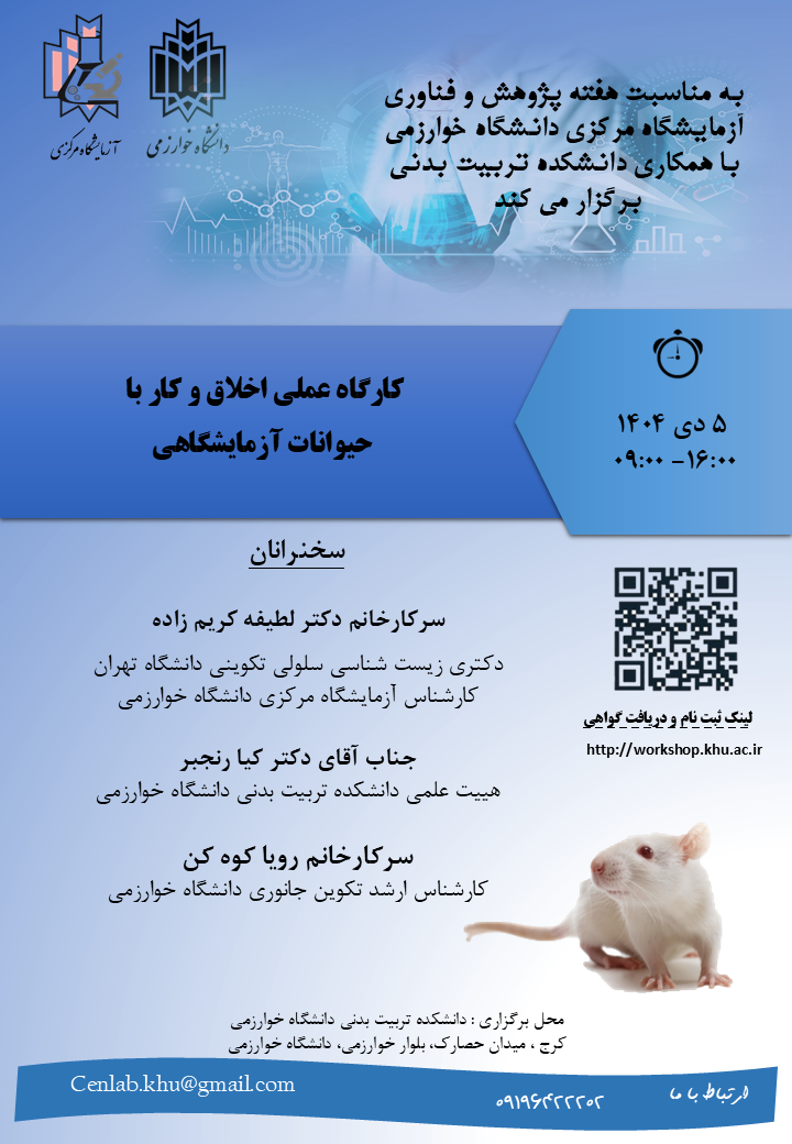 | کارگاه عملی اخلاق و کار با حیوانات آزمایشگاهی | خانم دکتر لطیفه کریم زاده جناب آقای دکتر کیا رنجبر سرکارخانم رویا کوه کن |